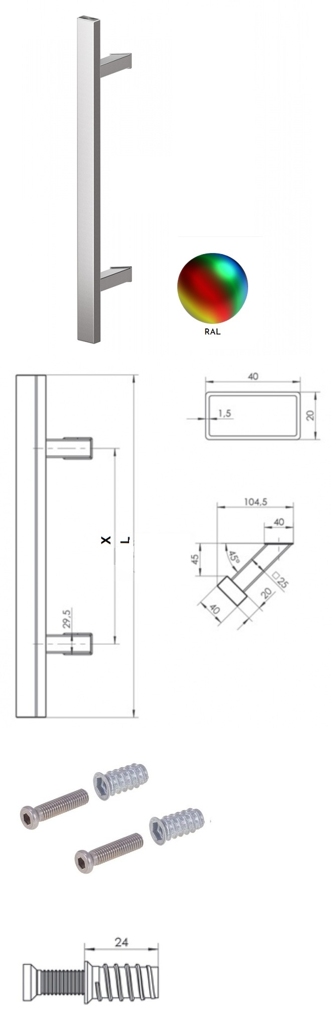 Pochwyt jednostronny Q45RX/Q10 aluminiowy, 40x20 mm, 1300/1800 mm + Mocowanie pochwytu za pomocą blaszki do profili ALU