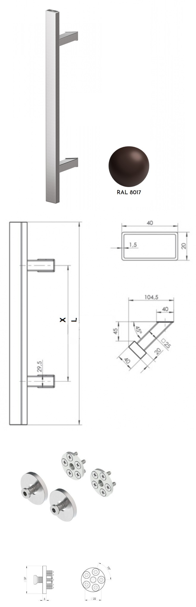 Pochwyt jednostronny Q45RX/Q10 aluminiowy, 40x20 mm, 380/580 mm + Mocowanie pochwytu za pomocą blaszki do profili ALU