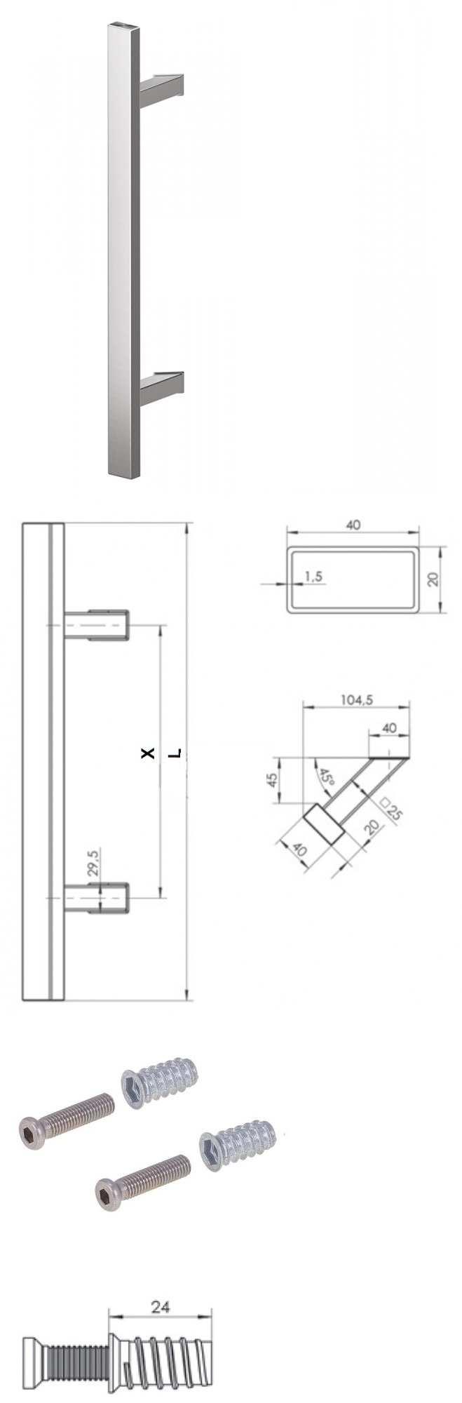 Pochwyt jednostronny Q45RX/Q10 aluminiowy, 40x20 mm, 600/800 mm + Mocowanie pochwytu za pomocą blaszki do profili ALU