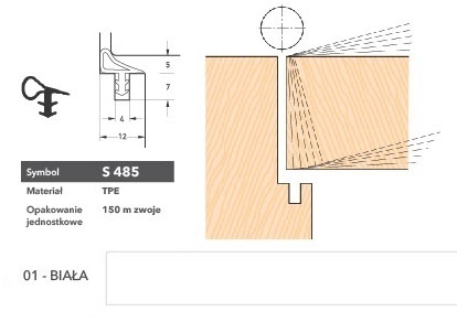 Uszczelka drzwiowa S 485 do drzwi wewnętrznych z przylgą, wykonana z TPE termoplastycznego elastomeru, który jest odporny na kontakt z farbami akrylowymi i wodorozcieńczalnymi, alkidowymi, rozpuszczalnikowymi i poliuretanowymi nie występuje tzw. efekt lepienia suchych powierzchni. Uszczelka wykazuje doskonałe własności fizyczne w zakresie temperatur od - 40 do + 1800 C; chroni przed utratą ciepła i przenikaniem dźwięku, charakteryzuje się dobrą pamięcią kształtu pierwotnego przy obciążeniu statycznym. Zastosowanie do drzwi wewnętrznych.