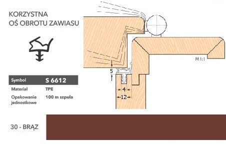 Uszczelka drzwiowa S 6612 do drzwi wewnętrznych z przylgą, wykonana z TPE termoplastycznego elastomeru, który jest odporny na kontakt z farbami akrylowymi i wodorozcieńczalnymi, alkidowymi, rozpuszczalnikowymi i poliuretanowymi nie występuje tzw. efekt lepienia suchych powierzchni. Uszczelka wykazuje doskonałe własności fizyczne w zakresie temperatur od - 40 do + 1800 C; chroni przed utratą ciepła i przenikaniem dźwięku, charakteryzuje się dobrą pamięcią kształtu pierwotnego przy obciążeniu statycznym. Zastosowanie do drzwi wewnętrznych.
