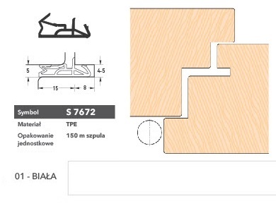 Uszczelka drzwiowa S 7672 do drzwi zewnętrznych, wykonana z TPE termoplastycznego elastomeru, który jest odporny na kontakt z farbami akrylowymi i wodorozcieńczalnymi, alkidowymi, rozpuszczalnikowymi i poliuretanowymi nie występuje tzw. efekt lepienia suchych powierzchni. Uszczelka wykazuje doskonałe własności fizyczne w zakresie temperatur od - 40 do + 1500 C; chroni przed utratą ciepła i przenikaniem dźwięku, charakteryzuje się dobrą pamięcią kształtu pierwotnego przy obciążeniu statycznym. Zastosowanie do drzwi zewnętrznych.