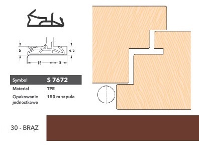Uszczelka drzwiowa S 7672 do drzwi zewnętrznych, wykonana z TPE termoplastycznego elastomeru, który jest odporny na kontakt z farbami akrylowymi i wodorozcieńczalnymi, alkidowymi, rozpuszczalnikowymi i poliuretanowymi nie występuje tzw. efekt lepienia suchych powierzchni. Uszczelka wykazuje doskonałe własności fizyczne w zakresie temperatur od - 40 do + 1500 C; chroni przed utratą ciepła i przenikaniem dźwięku, charakteryzuje się dobrą pamięcią kształtu pierwotnego przy obciążeniu statycznym. Zastosowanie do drzwi zewnętrznych.