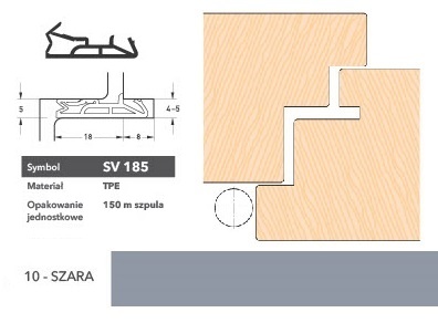 Uszczelka do drzwi zewnętrznych SV185 wykonana z TPE termoplastycznego elastomeru, który jest odporny na kontakt z farbami akrylowymi i wodorozcieńczalnymi, alkidowymi, rozpuszczalnikowymi i poliuretanowymi nie występuje tzw. efekt lepienia suchych powierzchni. Uszczelka wykazuje doskonałe własności fizyczne w zakresie temperatur od - 40 do + 1800 C; chroni przed utratą ciepła i przenikaniem dźwięku, charakteryzuje się dobrą pamięcią kształtu pierwotnego przy obciążeniu statycznym. Zastosowanie do drzwi zewnętrznych.