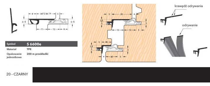 Uszczelka przymykowa S 6600 do ruchomego słupka drewnianych okien i drzwi balkonowych. Wykonana z TPE termoplastycznego elastomeru, który zapewnia dobry kontakt z powierzchniami pokrytymi farbami i lakierami akrylowymi, wodorozcieńczalnymi, alkidowymi, poliuretanowymi i epoksydowymi. Uszczelka wykazuje doskonałe własności fizyczne w zakresie temperatur od - 40 do + 1800 C.