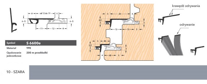 Uszczelka przymykowa S 6600 do ruchomego słupka drewnianych okien i drzwi balkonowych. Wykonana z TPE termoplastycznego elastomeru, który zapewnia dobry kontakt z powierzchniami pokrytymi farbami i lakierami akrylowymi, wodorozcieńczalnymi, alkidowymi, poliuretanowymi i epoksydowymi. Uszczelka wykazuje doskonałe własności fizyczne w zakresie temperatur od - 40 do + 1800 C.