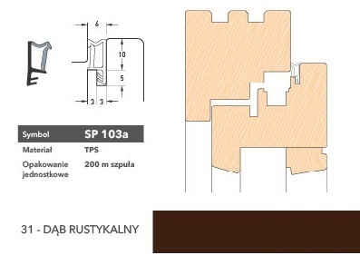 Uszczelka okienna SP103a przylgowa wykonana ze spienionego TPS termoplastycznego elastomeru, który zapewnia dobry kontakt z powierzchniami pokrytymi farbami i lakierami akrylowymi, wodorozcieńczalnymi, alkidowymi, poliuretanowymi i epoksydowymi. Uszczelka wykazuje doskonałe własności fizyczne w zakresie temperatur od - 40 do + 1800 C; chroni przed utratą ciepła i przenikaniem dźwięku, charakteryzuje się dobrą pamięcią kształtu pierwotnego przy obciążeniu statycznym. Zastosowanie do okien drewnianych.