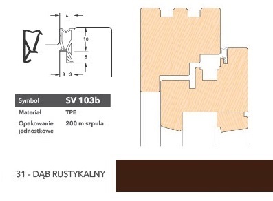 Uszczelka okienna SV103b wykonana z TPE termoplastycznego elastomeru, który jest odporny na kontakt z farbami akrylowymi i wodorozcieńczalnymi. Uszczelka wykazuje doskonałe własności fizyczne w zakresie temperatur od - 40 do + 1800 C; chroni przed utratą ciepła i przenikaniem dźwięku, charakteryzuje się dobrą pamięcią kształtu pierwotnego przy obciążeniu statycznym. Zastosowanie do okien drewnianych.