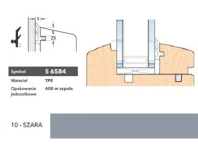 Uszczelka okienna S6584 wykonana z TPE termoplastycznego elastomeru, który zapewnia dobry kontakt z powierzchniami pokrytymi farbami i lakierami akrylowymi, wodorozcieńczalnymi, alkidowymi, poliuretanowymi i epoksydowymi. Uszczelka wykazuje doskonałe własności fizyczne w zakresie temperatur od - 40 do + 1800 C; chroni przed utratą ciepła i przenikaniem dźwięku, charakteryzuje się dobrą pamięcią kształtu pierwotnego przy obciążeniu statycznym. Zastosowanie do okien drewnianych.