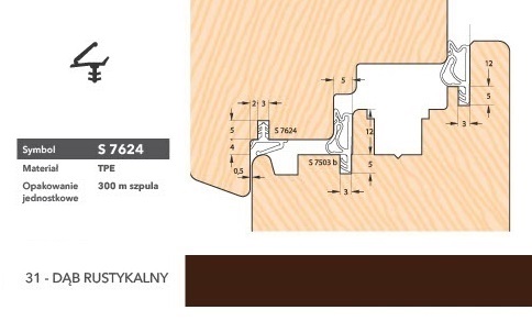Uszczelka okienna S7624 wykonana z TPE termoplastycznego elastomeru, który zapewnia dobry kontakt z powierzchniami pokrytymi farbami i lakierami akrylowymi, wodorozcieńczalnymi, alkidowymi, poliuretanowymi i epoksydowymi. Uszczelka wykazuje doskonałe własności fizyczne w zakresie temperatur od - 40 do + 1800 C; chroni przed utratą ciepła i przenikaniem dźwięku, charakteryzuje się dobrą pamięcią kształtu pierwotnego przy obciążeniu statycznym. Zastosowanie do okien drewnianych.