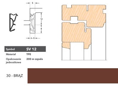 Uszczelka okienna SV12 wykonana z TPE termoplastycznego elastomeru, który zapewnia dobry kontakt z powierzchniami pokrytymi farbami i lakierami akrylowymi, wodorozcieńczalnymi, alkidowymi, poliuretanowymi i epoksydowymi. Uszczelka wykazuje doskonałe własności fizyczne w zakresie temperatur od - 40 do + 1800 C; chroni przed utratą ciepła i przenikaniem dźwięku, charakteryzuje się dobrą pamięcią kształtu pierwotnego przy obciążeniu statycznym. Zastosowanie do okien drewnianych.