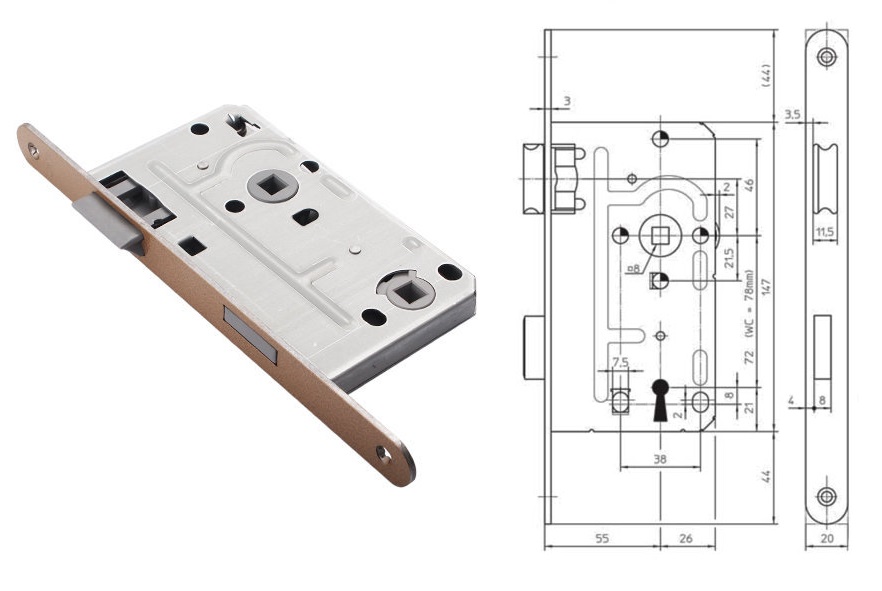 Zamek do drzwi wewnętrznych i zewnętrznych WC 115-1/2 18/55/78/8
