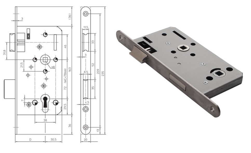 Zamek do drzwi wewnętrznych i zewnętrznych WC 115-1/2 20/55/78/8