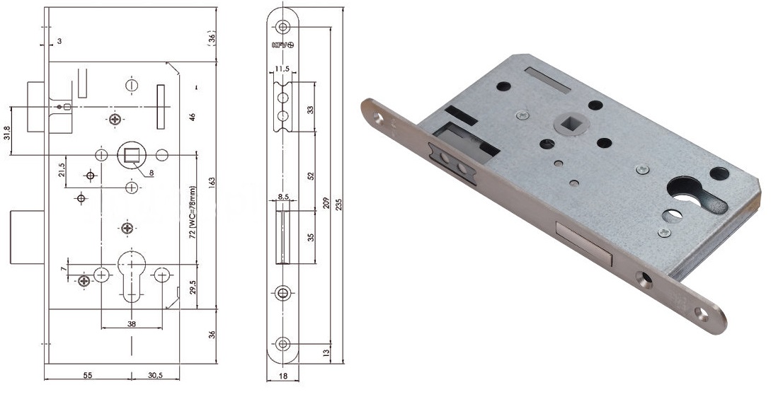 Zamek do drzwi wewnętrznych i zewnętrznych WC 115-1/2 18/55/78/8