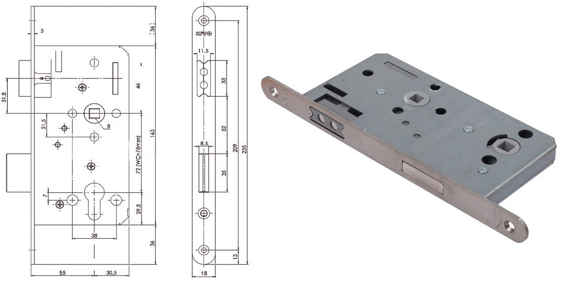Zamek do drzwi wewnętrznych i zewnętrznych WC 115-1/2 18/55/78/8