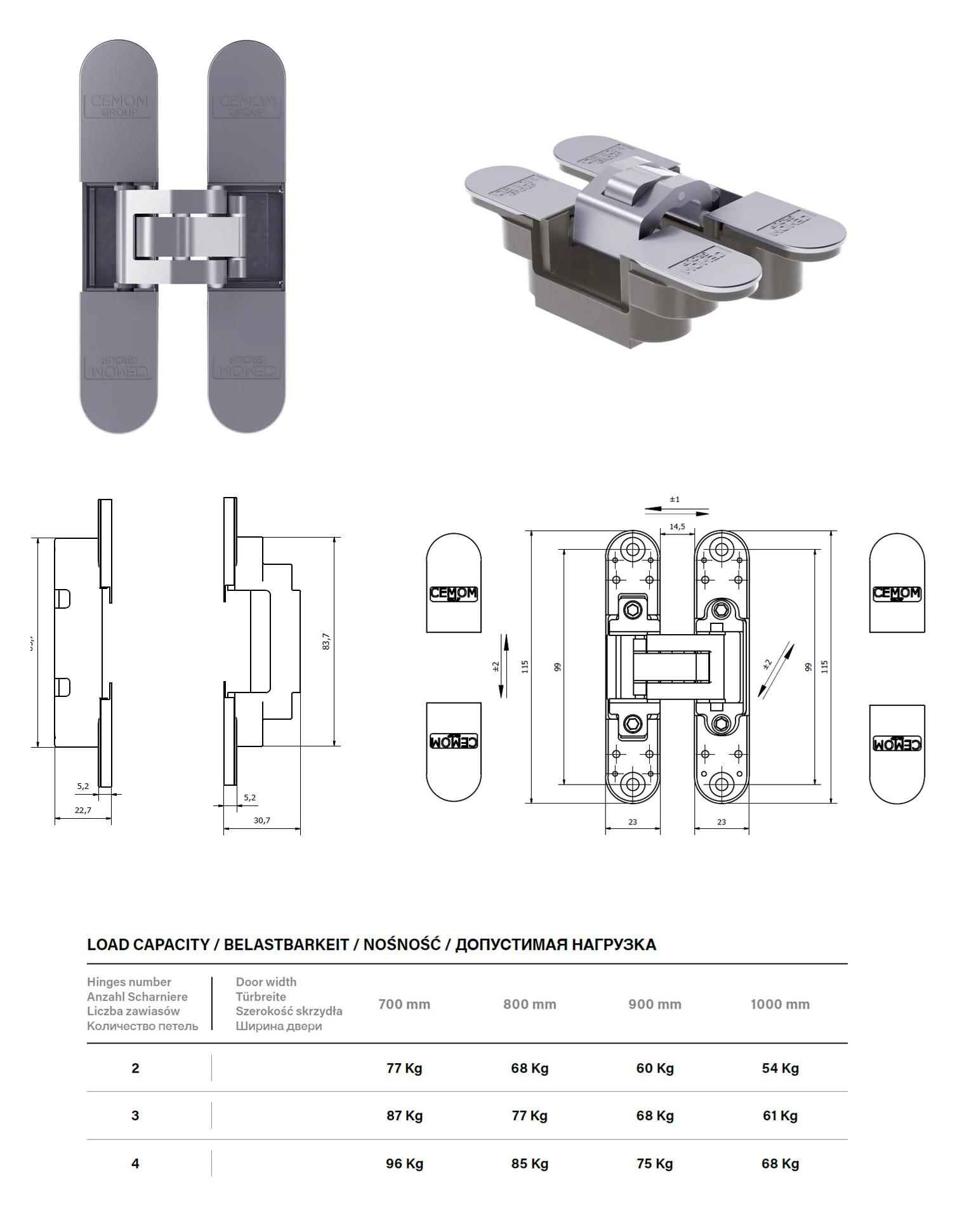 Całkowicie ukryty zawias dla drzwi lewych i prawych(uniwersalny), oferujący nośność do 60 kg przy użyciu dwóch zawiasów(szerokość skrzydła 900mm). Może być stosowany w profilach drewnianych, stalowych i aluminiowych w drzwiach bezprzylgowych. Wyposażony w bezobsługowe łożyska, zawias posiada regulację 3D: poziomą +/-2mm, wysokościową +/-2mm i docisku uszczelki +/-1mm. Dodatkowo, zawiera nasadki maskujące ABS śruby mocujące jak i regulacyne. Umożliwia kąt otwarcia 180°. Kolor wykoczenia chrom satyna.